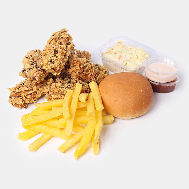 سبد خانوادهسه تیکه مرغ سوخاری، دو تیکه فیله سوخاری، قارچ سوخاری، پیاز حلقهای، سیب زمینی سرخ شده، دو عدد سالاد کلم، ٣ عددنان بروچن1000000 تومان