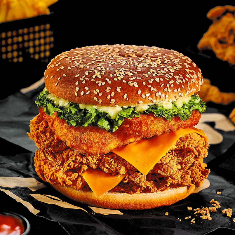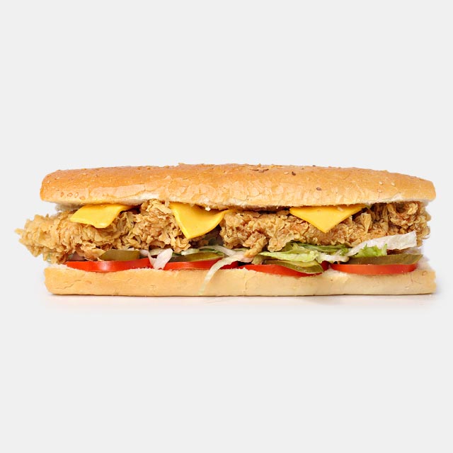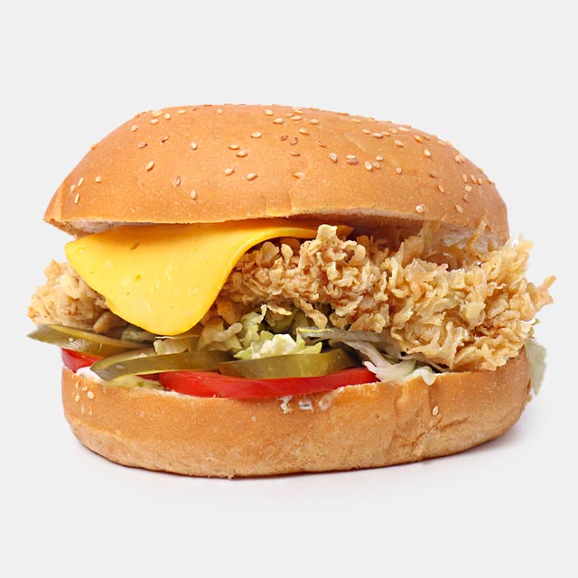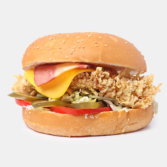 اسپایسی زینگرفیله مرغ سوخاری، ژامبون، فلفل تند، پنیر ورقه ای گودا ، کاهو، گوجه، خیار شور1000000 تومان